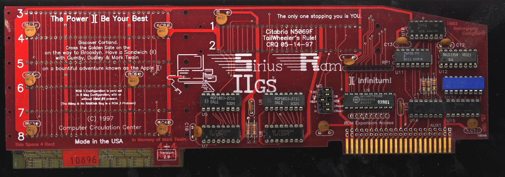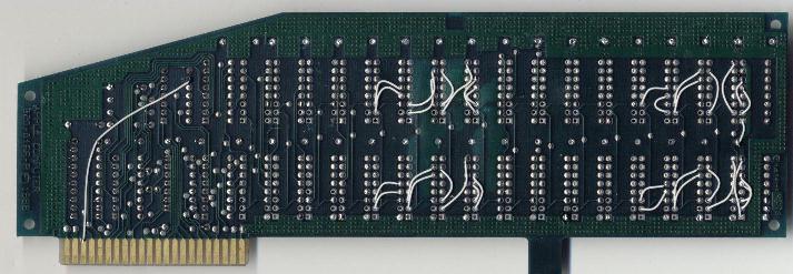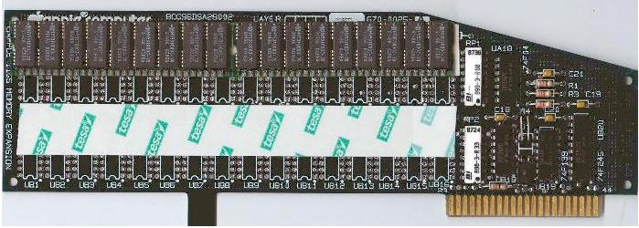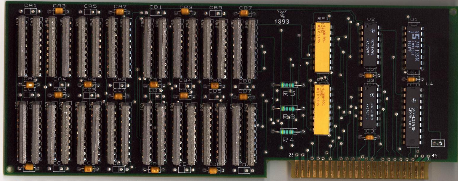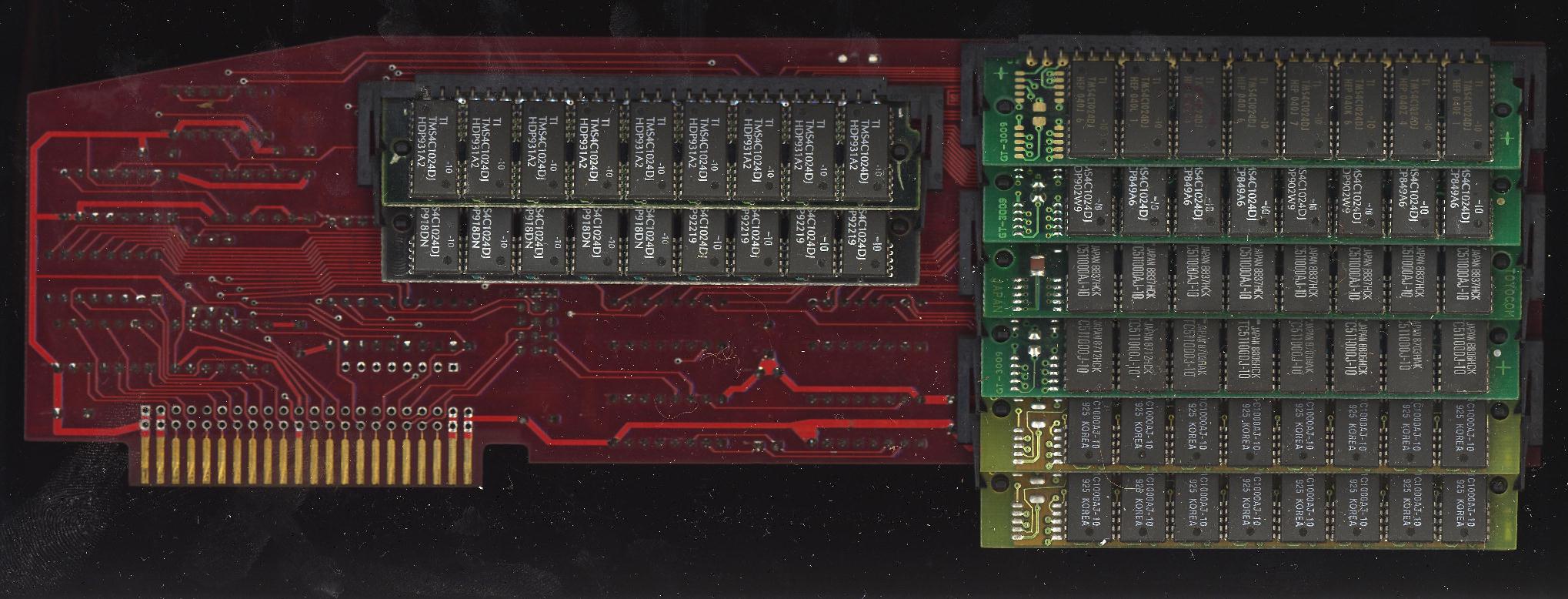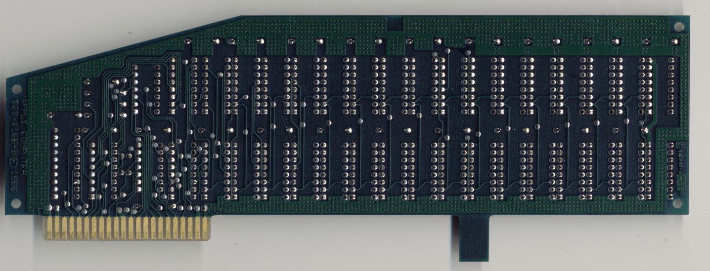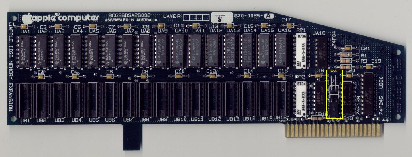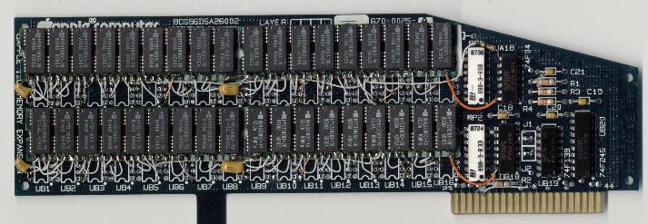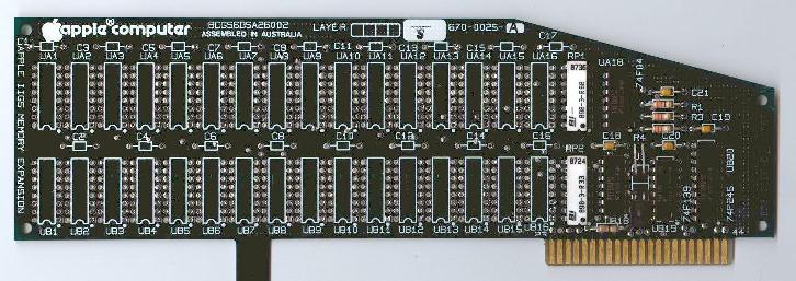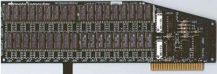 Do Apple 2gs używa się wielu kart rozszerzeń. Podstawową kartą jest karta rozszerzenia pamięci montowana w specjalnym slocie. Oto wygląd typowej karty o podstawowej pojemności 256k rozszerzalnej do 1M przez włożenie kostek 41256 w wolne podstawki. Na poniższym zdjęciu widać dwa obsadzone banki 256K: pierwszy (kostki UA1 - UA8 wlutowane) i drugi (UA9 - UA16 włożone w podstawki). Banki trzeci i czwarty nie są obsadzone. Karta ma więc pojemność 512K. Po prawej stronie zaznaczono złącza do zakładania zworek konfiguracyjnych pamięci; po obsadzeniu wszystkich banków oba złącza powinny być zwarte: